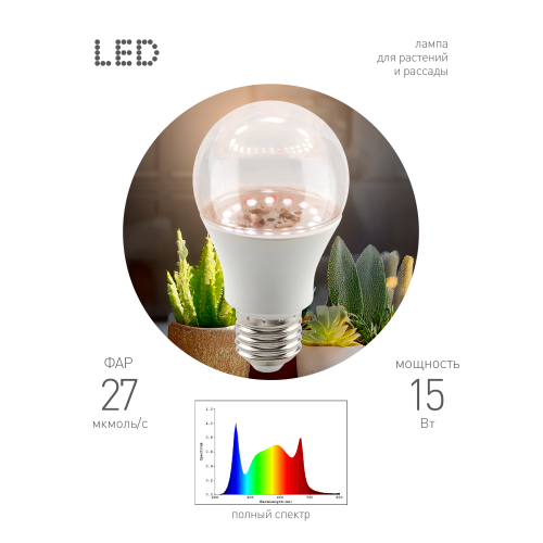 Полноспектральная фитолампа 15 Вт новой линейки бытового фитоосвещения ЭРА Green Line, которая объединила в себе все базовые фитопродукты для выращивания растений в домашних условиях. В линейке представлены как экстрапопулярные лепестковые лампы, так и мощные лампы POWER, лампы с колбами А60, А65. Расширен ассортимент фитоламп с цоколем E27. Форма данной фитолампы как у обычной лампы накаливания. Тип цоколя — самый популярный: Е27. Специальный спектр света делает комнатные растения здоровыми и позволяет им быстрее расти. Фитолампа подходит и для эффективного выращивания рассады. Бледно-розовое освещение комфортно для глаз человека и домашних питомцев.