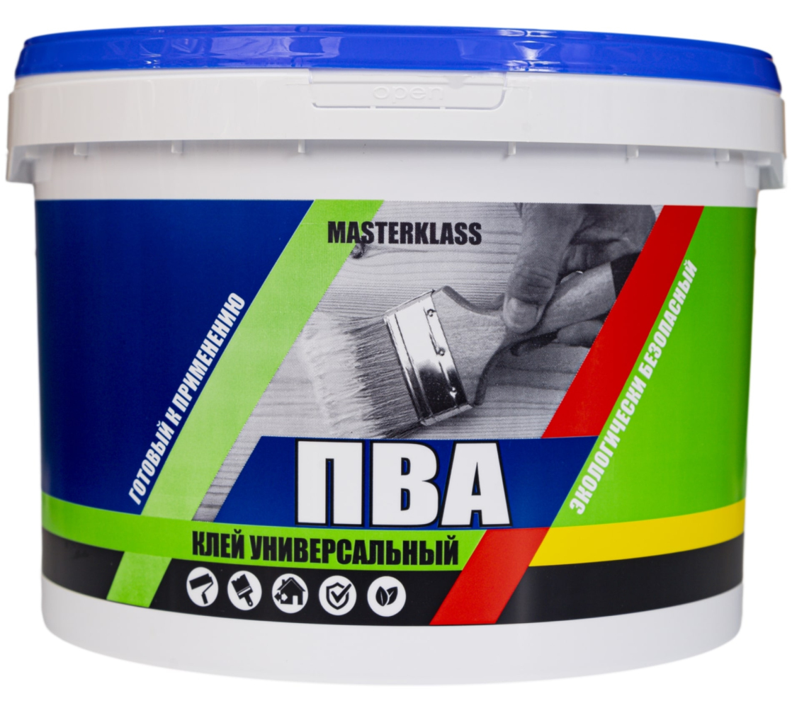Клей ПВА Универсальный влагостойкий, обладает высокой адгезией и хорошей клеящей способностью. Клей предназначен для склеивания изделий из бумаги, картона, фарфора, древесины, а так же для приклеивания обоев, стекловолокна, пленочных материалов на бумажной или тканевой подоснове и других облицовочных, декоративных и отделочных материалов. Может применяться в качестве грунтовки для сильно впитывающих оснований перед наклейкой обоев, при разведении водой в пропорции 1:2. После высыхания образует эластичную прозрачную пленку. Клей может использоваться в качестве пластификатора и дополнительного связующего в цементных и штукатурных растворах, при изготовлении стяжки и наклеивания кафельной плитки.