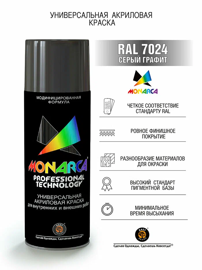 Monarca Аэрозольная краска RAL professional, цвет серый графит, объем баллона 520 мл. Высококачественная быстросохнущая акриловая краска используется в домашнем хозяйстве, для хобби, поделок, а так же рукоделия.