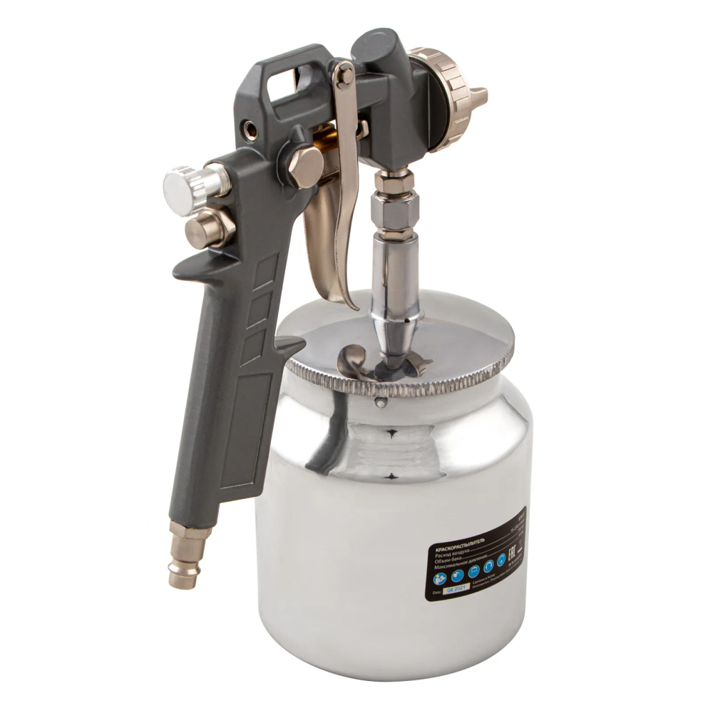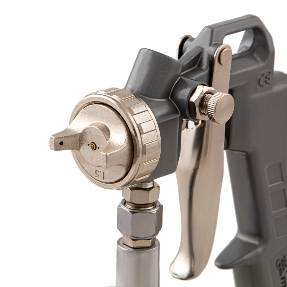 - Нижнее расположение бака — краскораспылитель можно ставить на горизонтальные поверхности, также он не загораживает обзор в процессе работы.