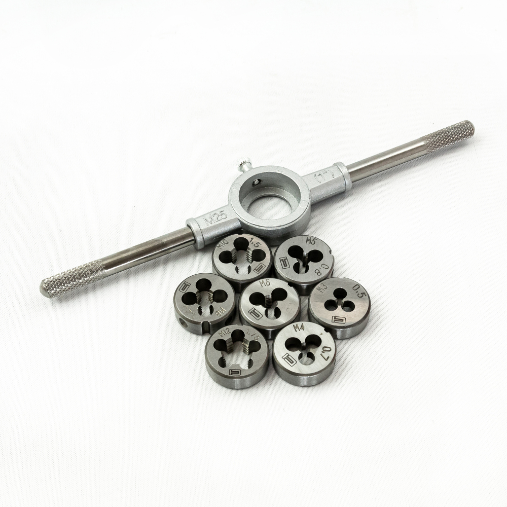 Набор плашек М3-М12, 8 предметов, применяется для нарезания внешней резьбы. Он рассчитан на работу с металлическими и стальными изделиями с пределом прочности 800 Н/мм2. Набор пригодится мастерам для скрепления различных деталей при проведении ремонта авто, бытовой техники, строительных работ.