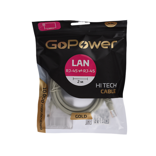 Патч-корд GoPower RJ-45 (m)-RJ-45 (m) 2м кат.5е ПВХ 26AWG CCA Premium Zip-Lock c подвесом