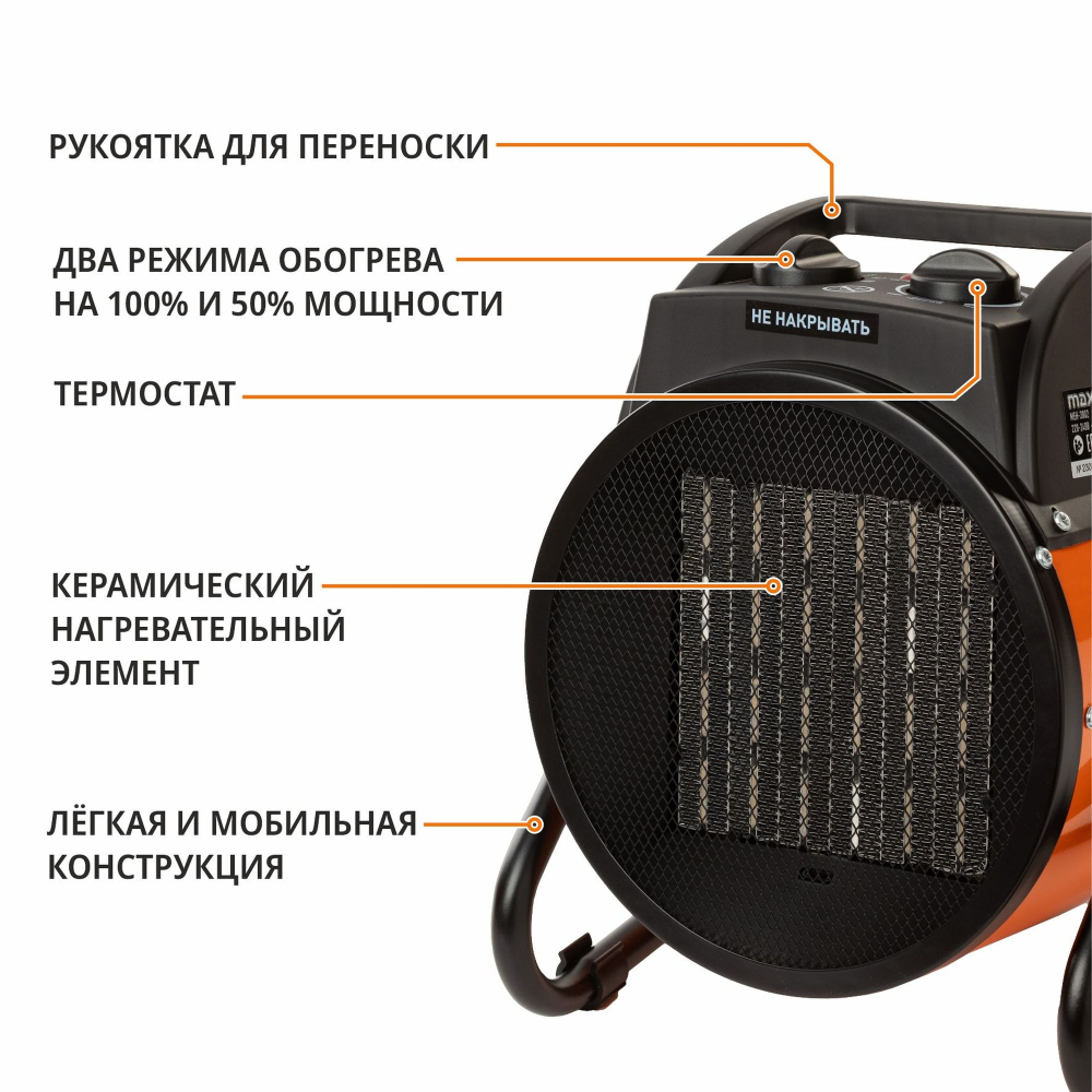 Керамический нагревательный элемент не сжигает кислород и обеспечивает долгий срок службы аппарата. Два режима работы на обогрев, термостат и режим вентилятора позволяют установить и поддерживать максимально комфортную температуру в помещении.