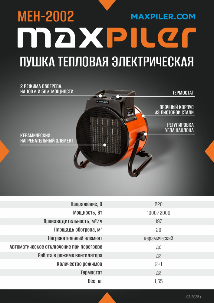 Пушка тепловая электрическая MAXPILER MEH-2002 2000Вт