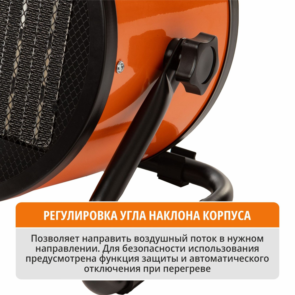 Регулировка угла наклона корпуса позволяет направить воздушный поток в нужном направлении. Для безопасности использования предусмотрена функция защиты и автоматического отключения при перегреве