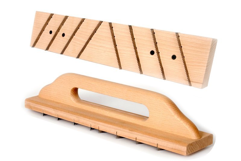 Рубанок по газобетону предназначен для выравнивания газосиликатных блоков при строительстве. Конструкция рубанка представляет собой деревянный корпус с рукоятью и установленными десятью стальными ножами из инструментальной стали. Для более качественной обработки поверхности ножи установлены под углом 30 градусов по отношению к перпендикуляру рабочей плоскости рубанка.