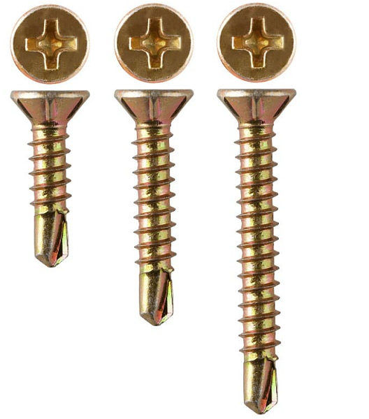 Особенности: для изготовления крепежных изделий используется сталь. Предусмотрено покрытие из желтого или белого цинка для защиты от коррозии. Это важно, так как окна эксплуатируются в неблагоприятных условиях, в том числе при повышенной влажности и перепадах температур. У самореза наконечник в форме бура, сверла, что позволяет проводить монтаж без предварительной подготовки монтажного отверстия. Шляпка плоская, потайная, с крестообразным шлицем. Саморез вкручивается отверткой или саморезом вровень с поверхностью и не препятствует эксплуатации окна.