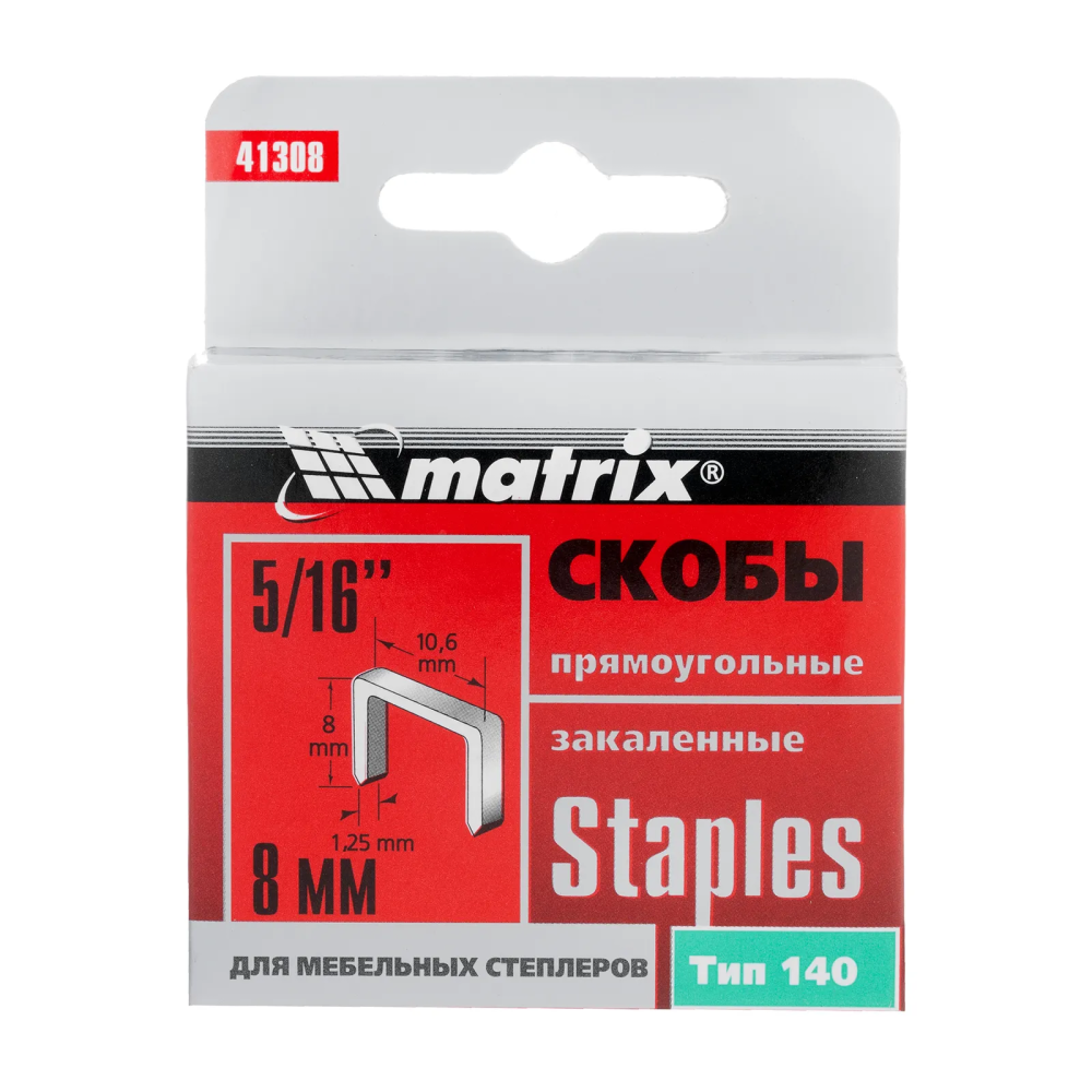 Закаленные скобы Matrix 41308 для мебельного степлера, тип 140, размером 8 х 10,6 х 1,25 мм, 1000 шт. в коробке, помогут обить мебель, зафиксировать утеплитель, а также выполнить другие отделочные и ремонтные работы. Скобы крепко соединяют различные материалы: древесину, фанеру, картон, ДСП.