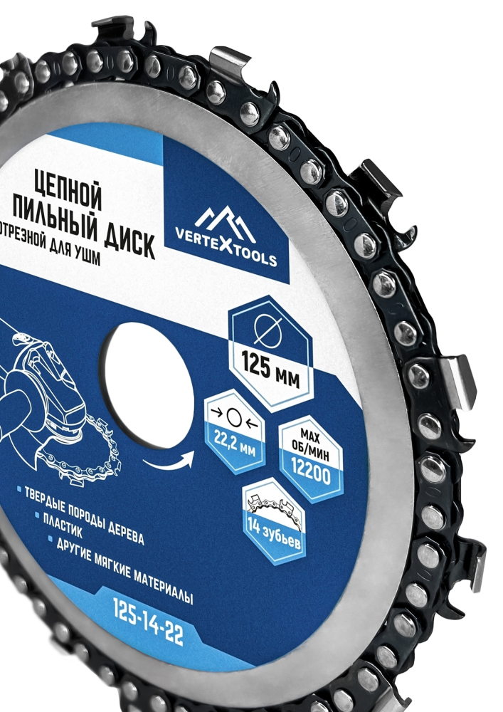 Цепной пильный диск отрезной для УШМ 125-14-22 предназначен для резки и обработки древесины и древесных материалов, фрезерования, моделирования. Подходит для резки твердых пород дерева, пластика и других мягких материалов.