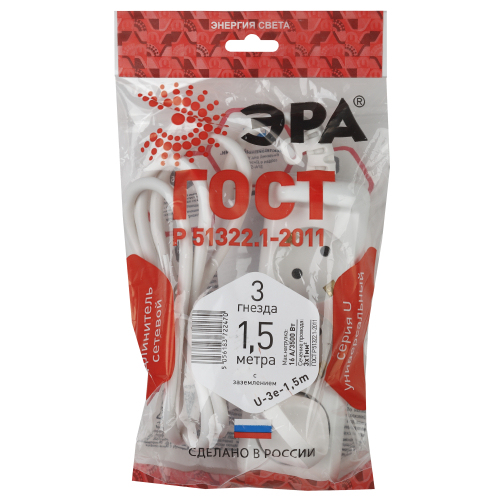 Удлинитель электрический Эра U-3e-1,5m с заземлением, ПВС, 3x1мм2, 3 розетки, 1,5м. Рассчитан на максимальную мощность 16А/3500 Вт. Удлинитель Эра станет Вашим надежным помощником, если Ваши любимые электроприборы находятся далеко от розеток. Провод в удлинителях Эра сделан из 100% меди, что делает его абсолютно пожаробезопасным. Корпус выполнен из ударопрочного и негорючего пластика (полипропилен). В моделях с заземлением у вилки есть кольцо для удобного извлечения из розетки. Модель удлинителя на 16А позволяет подключить мощные бытовые приборы общей нагрузкой до 3500Вт. Не бойтесь включить чайник, обогреватель, микроволновку или другие электроприборы. Толстый провод удлинителя Эра гарантирует полную безопасность. Дизайн удлинителя разработан в России командой Эра Style.