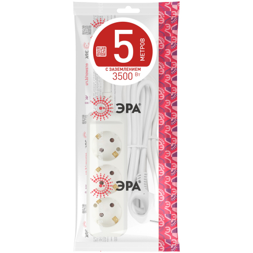 Удлинитель электрический Эра U-3e-5m с заземлением, ПВС, 3x1мм2, 3 розетки, 5м. Рассчитан на максимальную мощность 16А/3500 Вт. Удлинитель Эра станет Вашим надежным помощником, если Ваши любимые электроприборы находятся далеко от розеток. Провод в удлинителях Эра сделан из 100% меди, что делает его абсолютно пожаробезопасным. Корпус выполнен из ударопрочного и негорючего пластика (полипропилен). В моделях с заземлением у вилки есть кольцо для удобного извлечения из розетки. Модель удлинителя на 16А позволяет подключить мощные бытовые приборы общей нагрузкой до 3500Вт. Не бойтесь включить чайник, обогреватель, микроволновку или другие электроприборы. Толстый провод удлинителя Эра гарантирует полную безопасность. Дизайн удлинителя разработан в России командой Эра Style.